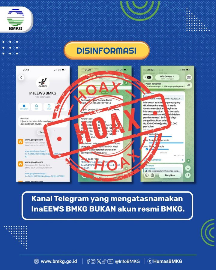 SUARA BAGANA, JAKARTA – Badan Meteorologi, Klimatologi, dan Geofisika (BMKG) mengimbau masyarakat untuk waspada terhadap grup, kanal, dan akun di