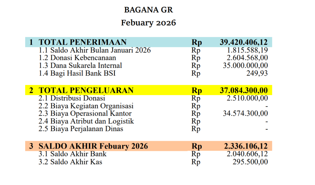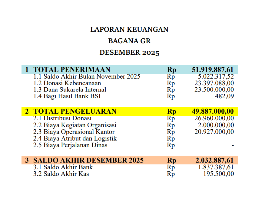 Berikut kami laporkan keuangan Bagana GR bulan Desember 2025, sebagai bentuk transparansi dan akuntabilitas kepada masyarakat. Setiap rupiah yang diterima